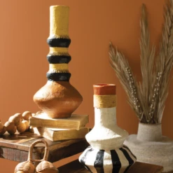 Add rustic charm to any home decor with this Biyu Paper Mache Printed Vase. This handcrafted piece is designed in India with a white and black striped base and copper and rust accents, perfect for displaying dried or faux florals. The 12.5″ vase is perfect for elevating any space.