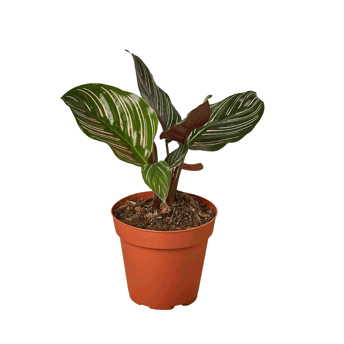 Native to the rainforests of Central and South America and also found in Africa and Thailand, Calatheas belong to the Marantaceae Family, or prayer plants, whose leaves open in the morning and close at night. Calathea Ornata is a variety are known for its elegant green and pink leaf pattern that look like they were delicately painted by Mother Nature herself. She remembered all her angles and gave the Pinstripe Plant leaf a deep maroon color underside.