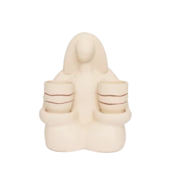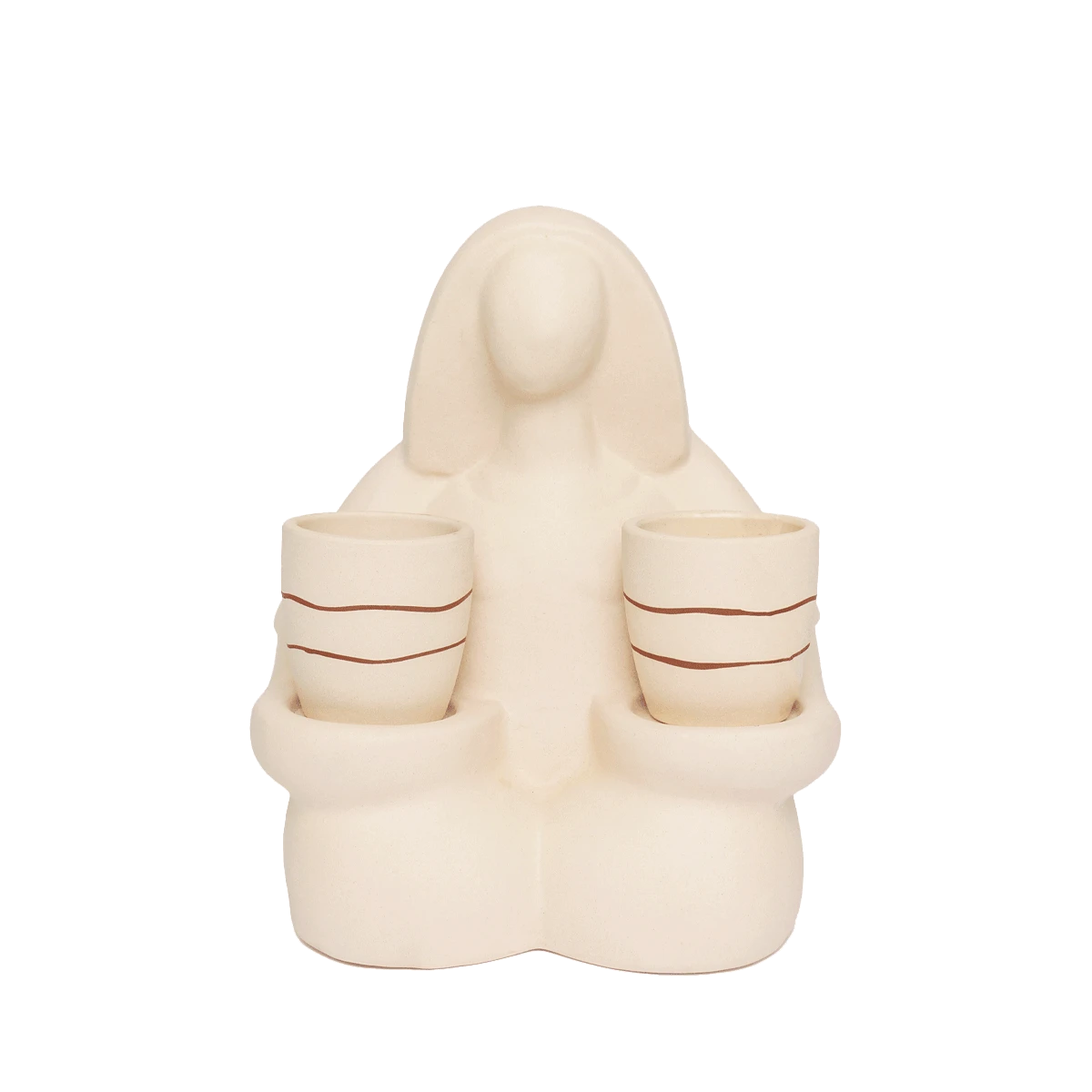 Found exclusively at Jungalow®, this sculptural ceramic planter is full of surprises. Our wise gardener is an ode to creating balance and prioritizing growth with her two wavy-striped planter pots in her arms. Pop in planties, spare jewelry, matches, or anything else your heart desires for a secure & stylish storage vessel.