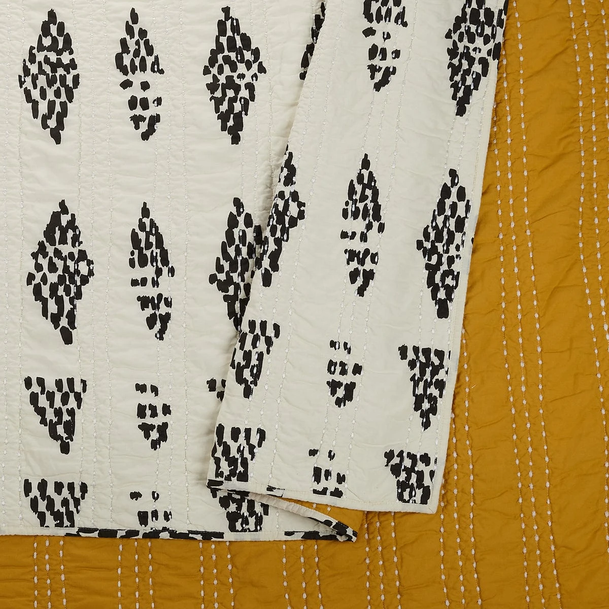 This classic color combo never goes out of style with a graphic charcoal motif on ivory. What makes this piece extra special is the kantha-style stitching in white that shows on both sides of the bedding – it’s all in the details! The reverse side of the quilt is a muted golden mustard hue with the contrast stitching in white. Fold down a corner for a small pop of gold or flip it completely – it’s totally reversible!