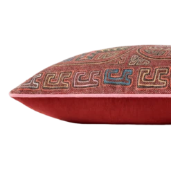 Bright and multicolored lines adorn the front of this pillow, creating artful designs in a bold red and pink palette.